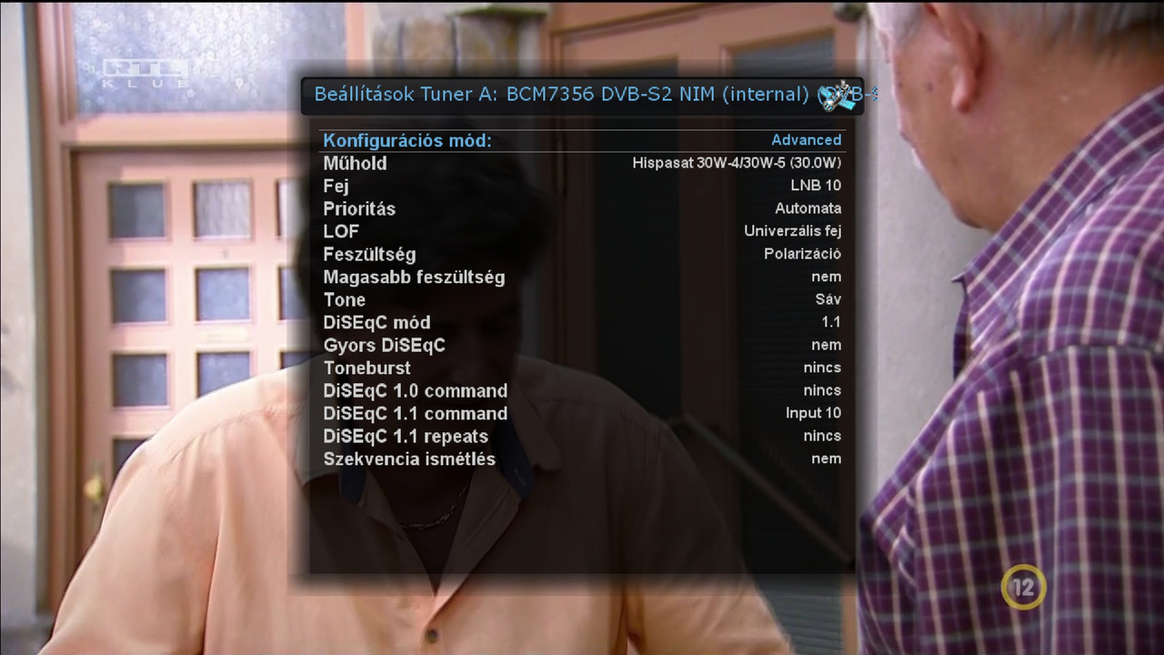 A tuner konfigurációs mód advanced, ha van diseqc relé és annak megfelelően beállítani a fejeket.