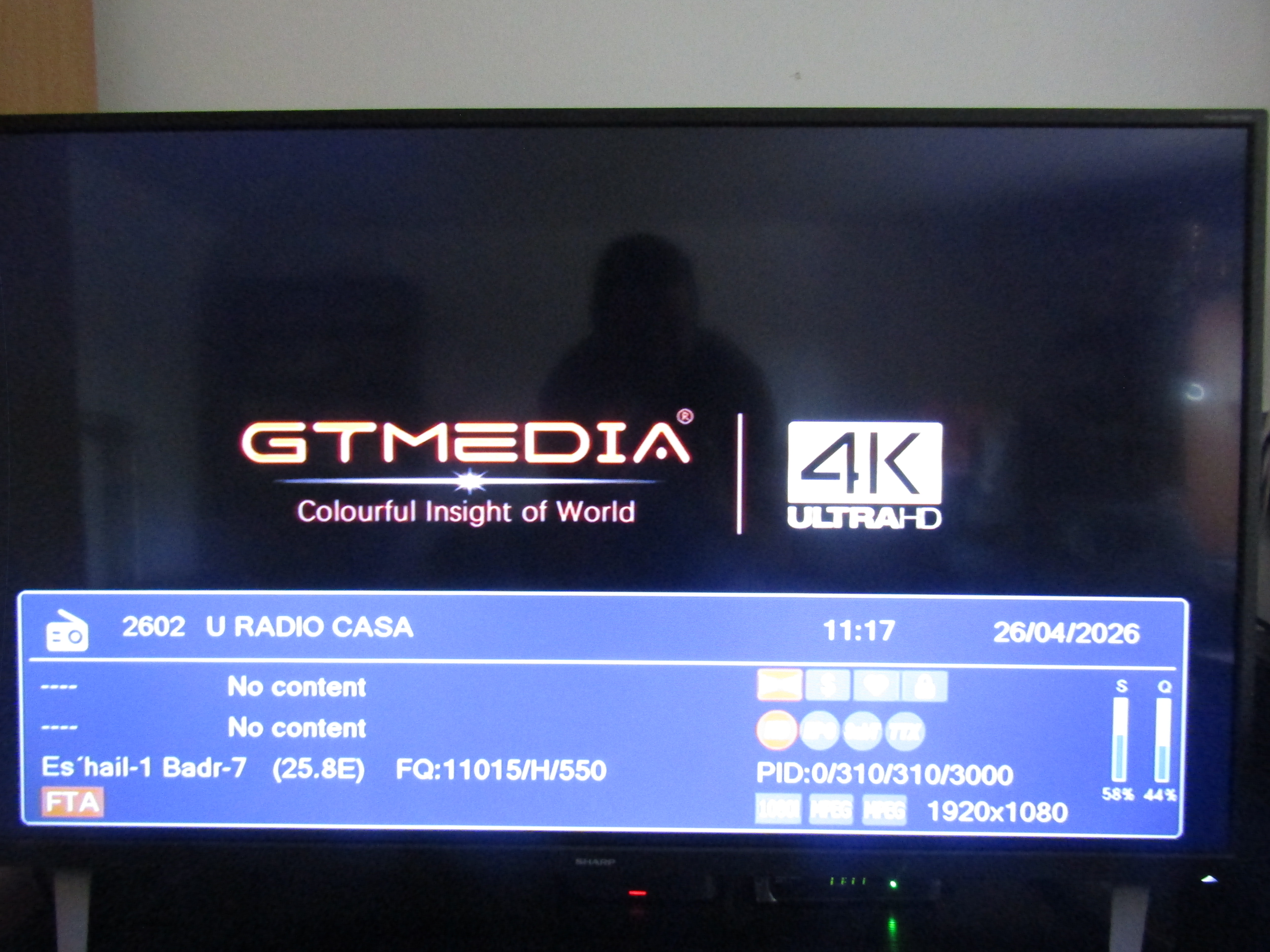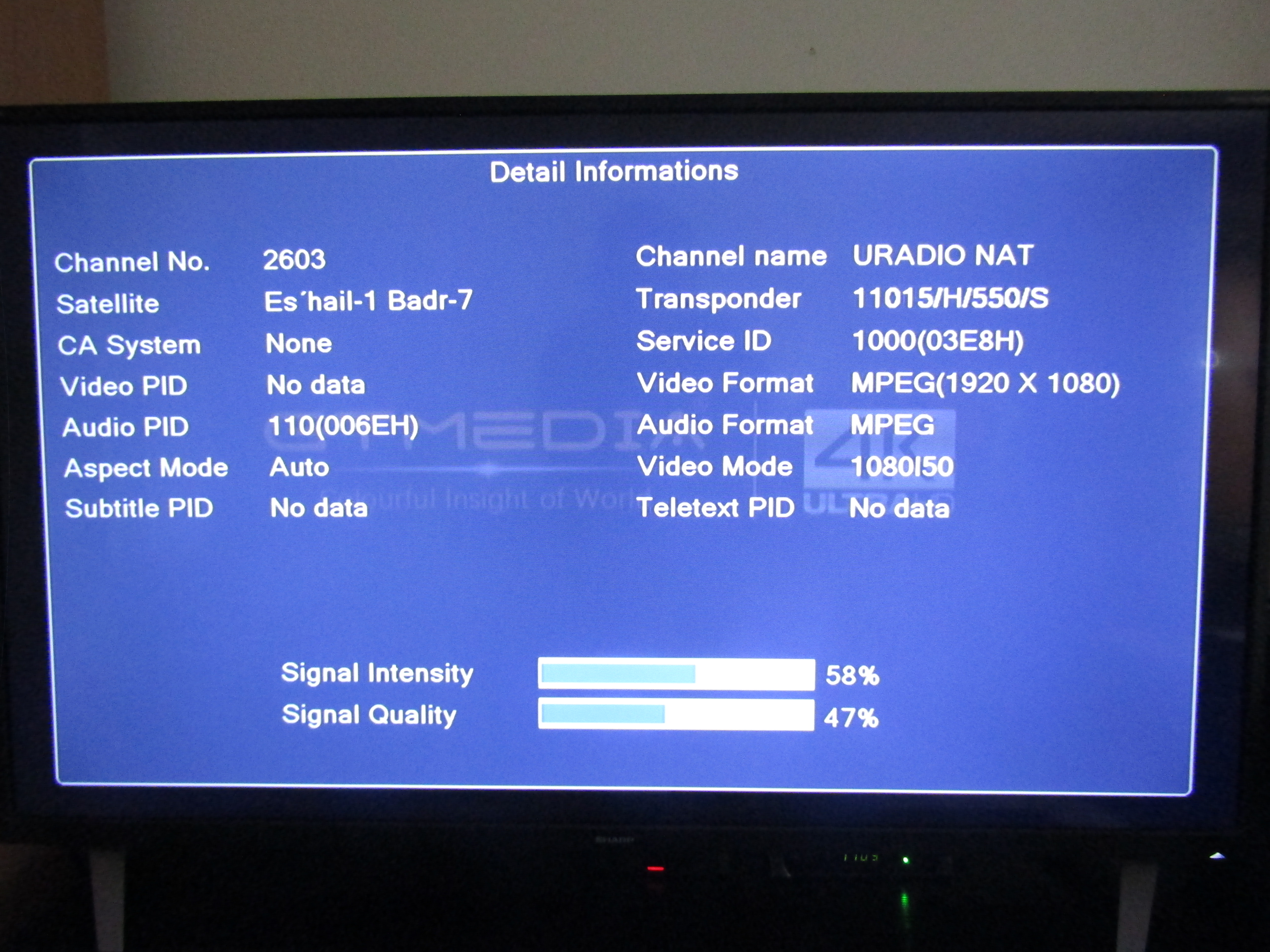 Keleti 26 fok, Badr-7, NW Africa beam, 11015 H SR: 550, URadio csomag. A rendkívül alacsony SR érték miatt csoda ez a vétel, eddig ilyesmi csak nyári melegben jött össze, tehát a fejnek is akarnia kell, ráadásul ez a nyaláb csak Isztriáig ér el hivatalosan, nálam 41-42 dBW lehet a jelerő. Régebben erről a nyalábról két afrikai adókat sugárzó csomag is jött, de sajnos ezek megszűntek. Viszont stabil vételt nyújt az MBC csomagja az East MENA beam-ról, elvileg annak is 41-42 dBW lehet a jelereje.