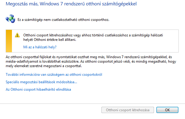 Arra meg ezt hozza fel, hogy nem aktív az otthoni csoport létrehozása, illetve otthoni csoport létrehozásához a számítógép hálózati helyét otthoni értékre kell állítani.